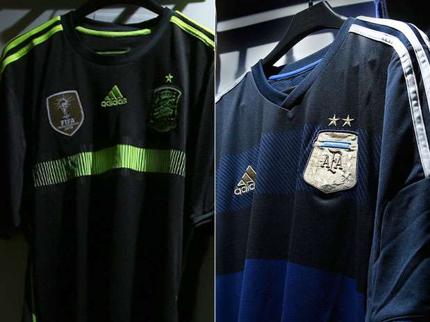 A Adidas, fornecedora de material esportivo de algumas das principais seleções que estarão na Copa do Mundo de 2014, divulgou nesta quinta-feira o uniforme de visitante de algumas favoritas ao título do torneio que acontece no Brasil em junho. A marca revelou as camisas 2 de Espanha, Argentina, Alemanha e Rússia. A grande surpresa ficou para o uniforme preto e neon dos espanhóis, atuais campeões do mundo. Confira os detalhes das novas vestimentas das seleções:
