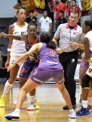 Para a volta do intervalo, uma situação inusitada: a tabela teve que ser abaixada para resolver um problema. Na hora de subir, teve que ser medida para ter a altura que é determinada. Uma trena foi colada na cesta para fazer a medição. Na hora de tirar, o pessoal do apoio fez a “lambança”, e desceu a tabela para tirar a trena, e aí o árbitro teve que fazer novamente a medição e alertar para que a tabela não fosse mais mexida.