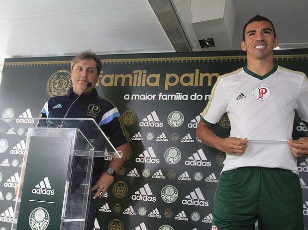 Com a presença do técnico Gilson Kleina, zagueiro Lúcio ataca de modelo e exibe a nova camisa do Palmeiras para o ano do centenário